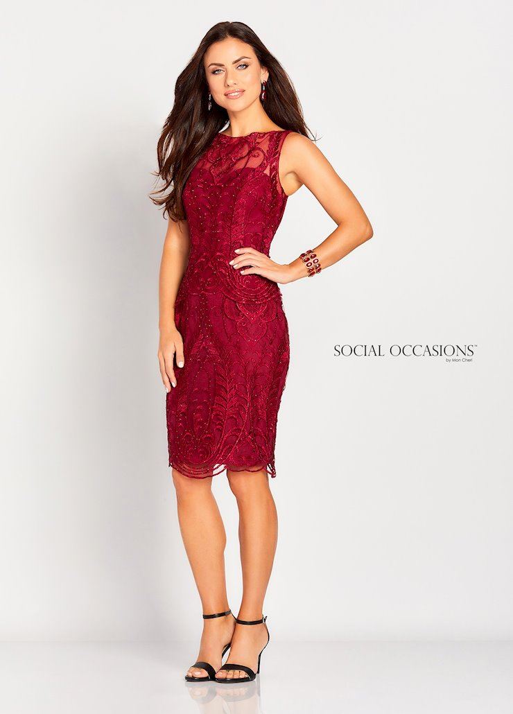 Looking to keep it classy and classic at your next formal event? We love the timeless elegance of this red cocktail dress! An art deco inspired print adds a unique and glamorous texture from the neckline all the way down to the scalloped edge of the skirt. We love that the totally on-trend high neckline is made even more dramatic with a sheer detail around the collar bone area for a subtle and alluring peek of skin. The cinched bodice flows into a natural waist before floating into the straight skirt for the ultimate figure flattering silhouette. Dare to create the new classic in this romantic red cocktail dress from Social Occasions by Mon Cheri.